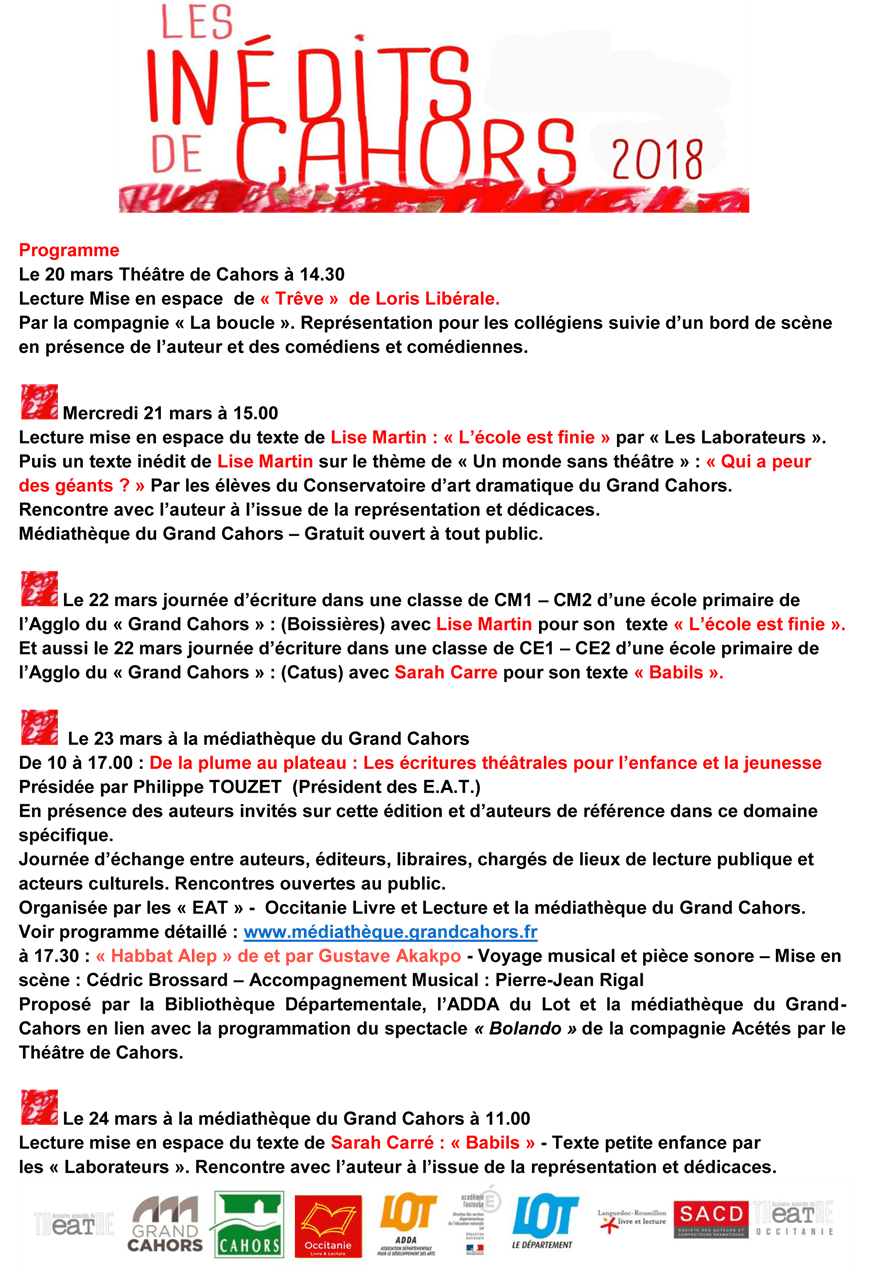 Pour cette 3ème édition, Dominique Pompougnac le président de la délégation Occitanie des Ecrivains Associés du Théâtre, initiateur de ce projet, affirme avec « les inédits de Cahors » la volonté de mettre en valeur les auteurs de théâtre et faire connaître au public la diversité des écritures.
