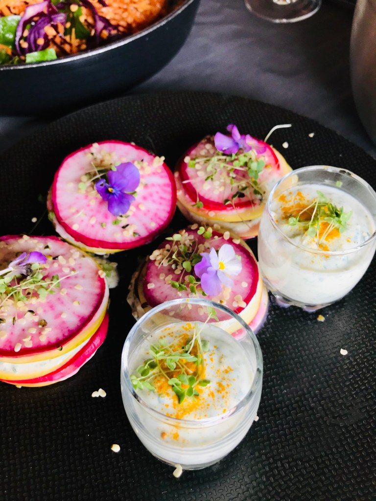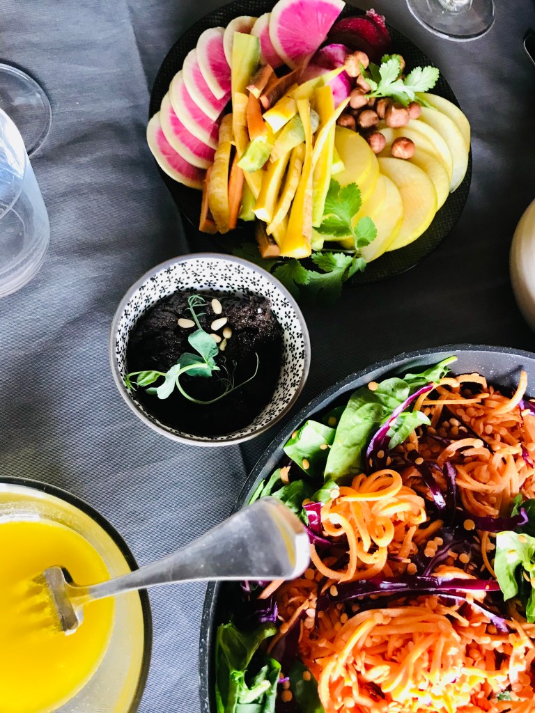 Tout était réuni afin de proposer des recettes riches en vitamines, nutriments et oligo-éléments. Ce jour-là huit recettes étaient au programme : jus vitalité aux fruits et légumes de saison, tisane, mille-feuilles, salade exotique, houmous cru cajou, raw soup réconfortante, spaghettis de patates douces… Après la réalisation des assiettes il y a eut un temps de dégustation, de partage et d’échanges autour des expériences de chacune.